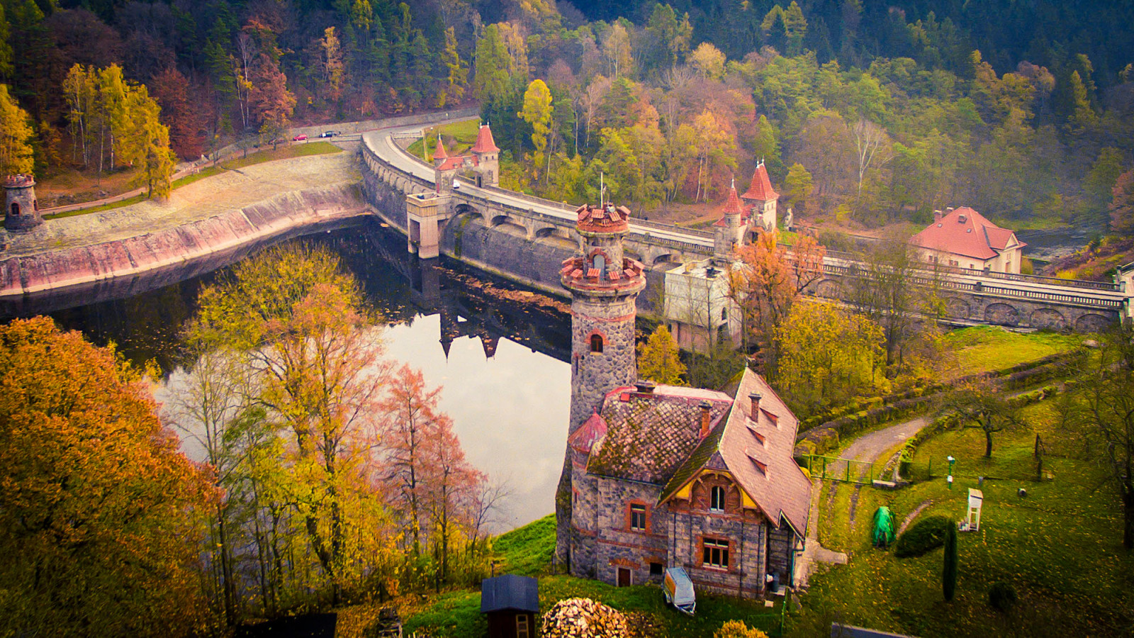 Podzimní přehrada Les Království z dronu Ládi Válka